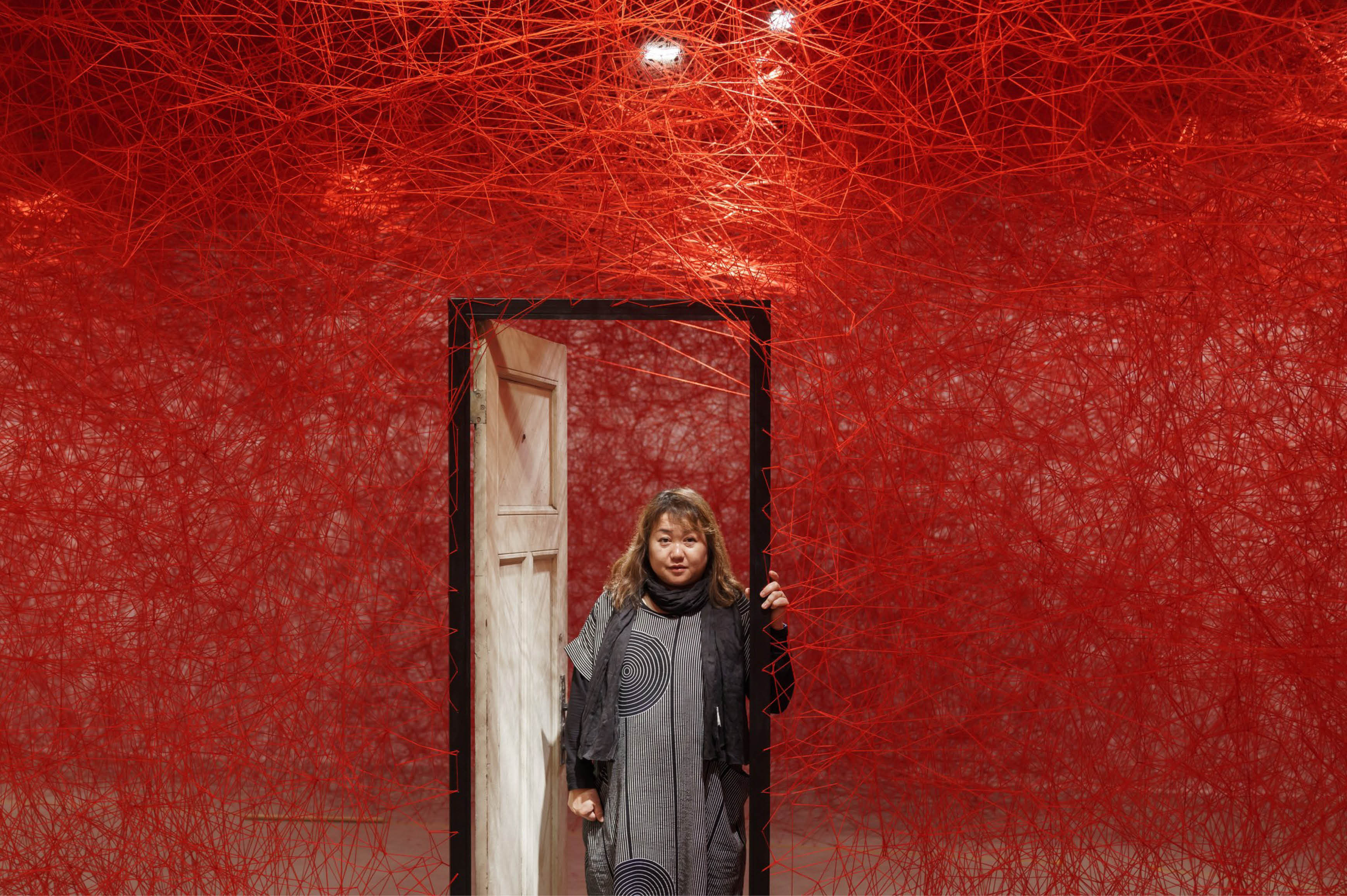 Tracing Boundaries is an immersive installation by Chiharu Shiota, where dense networks of red threads and suspended doors form a labyrinthine environment. The work evokes bodily and neural structures, inviting visitors to move through a space shaped by memory, presence and absence. Set within EMMA’s concrete architecture, the installation creates a striking contrast between organic form and rigid structure, transforming the space into an emotional and contemplative experience that explores the boundaries between the visible and the unseen.