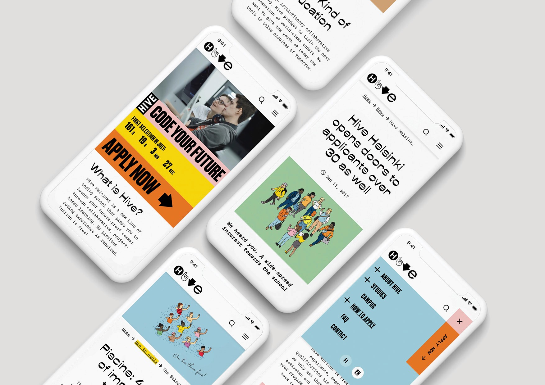 Hive Helsinki is a coding school founded by Supercell to tackle the global shortage of developers. Inspired by the pioneering École 42 model, the school removes traditional teachers and classrooms, replacing them with a peer-to-peer learning environment built around real-world projects. We created the visual identity for Hive, shaping a bold and expressive brand language inspired by hieroglyphs, emojis and pop culture. Vibrant colours, typography, illustration and photography come together to form a playful yet ambitious identity that reflects the school’s open, curious and international spirit.